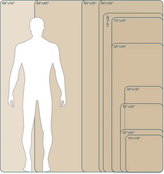 Bed-Sized Mats: 80”x30;” 80”x38”; 80”x60”; 80”x76”